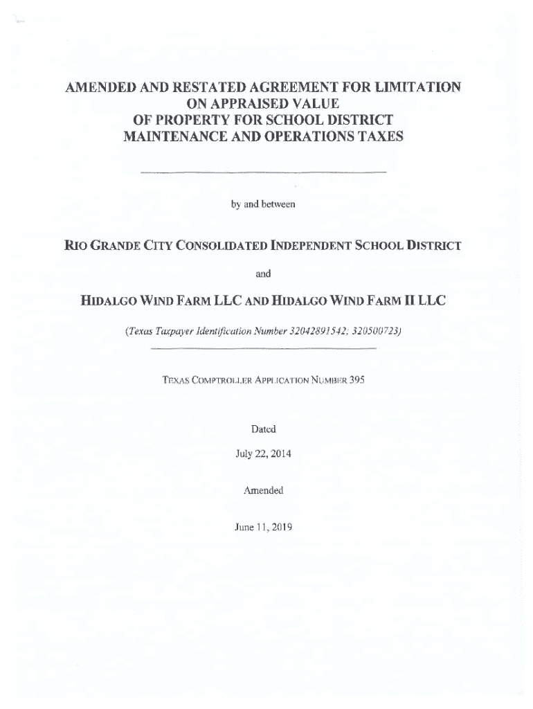 AMENDED AND RESTATED AGREEMENT FOR LIMITATION ON APPRAISED VALUE OF PROPERTY FOR SCHOOL DISTRICT MAINTENANCE AND OPERATIONS TAXES by and between RIO GRANDE CITY CONSOLIDATED INDEPENDENT SCHOOL DISTRICT