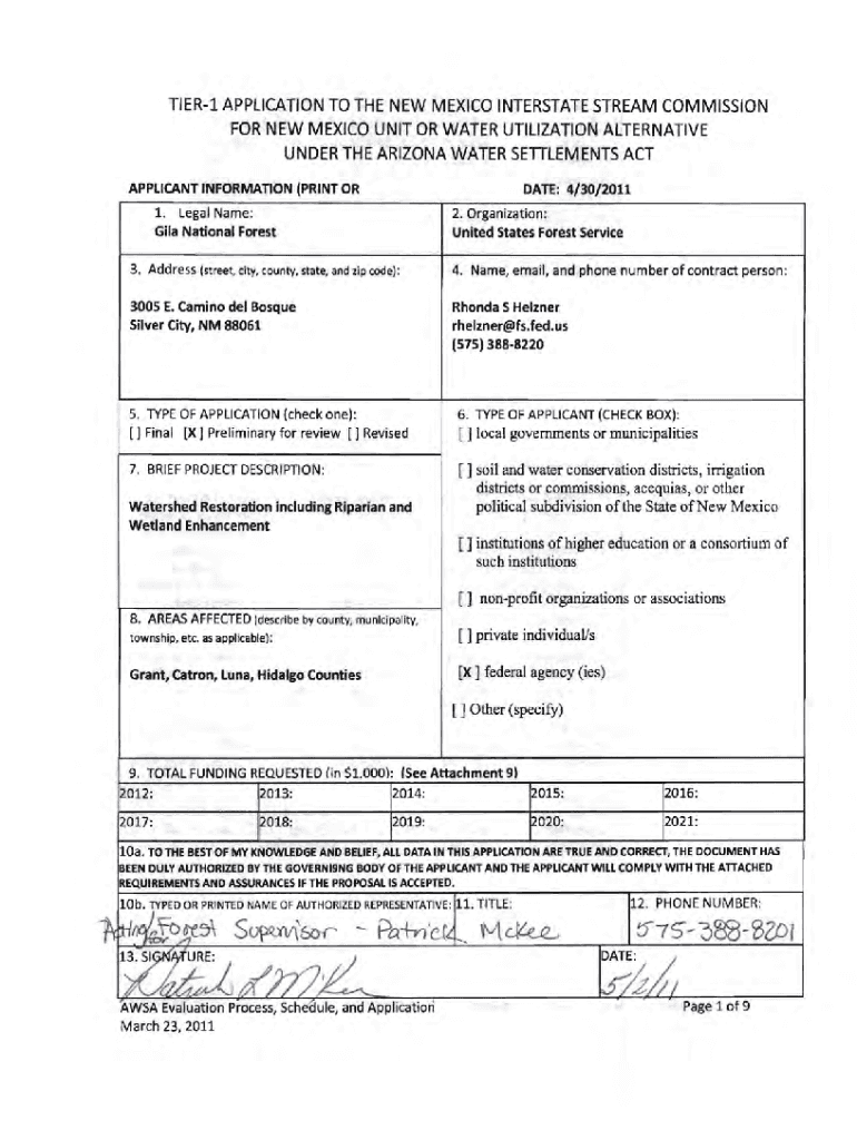 Tier APPLICATION TO THE NEW MEXICO INTERSTATE STREAM COMMISSIONER NEW MEXICO UNIT OR WATER UTILIZATION ALTERNATIVEUNDER THE ARIZONA WATER SETTLEMENTS APPLICANT INFORMATION (PRINT ORNATE: 4/30/20111.