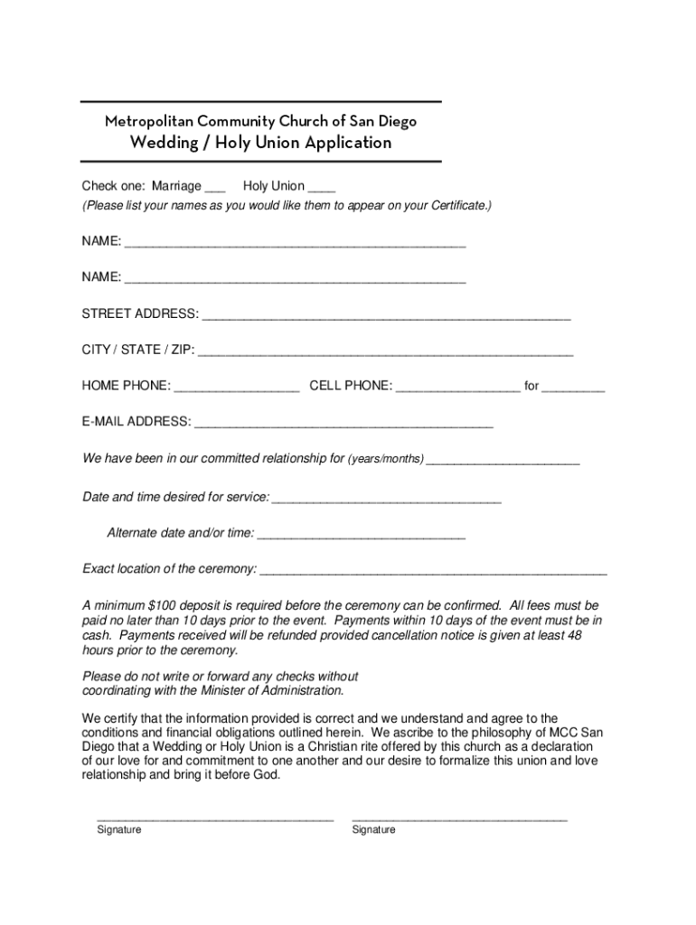 Metropolitan Community Church of San DiegoWedding / Holy Union Application Check one: Marriage ___ Holy Union ___ (Please list your names as you would like them to appear on your Certificate.) NAME: