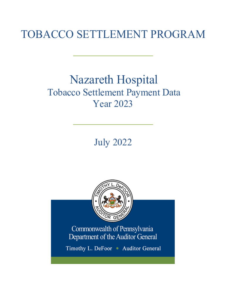 TOBACCO SETTLEMENT PROGRAM___Nazareth HospitalTobacco Settlement Payment Data Year 2023___ July 2022June 30, 2022 Mr. David Wanda Chief Financial Officer, Acute Care Trinity Health mid-Atlantic 3805