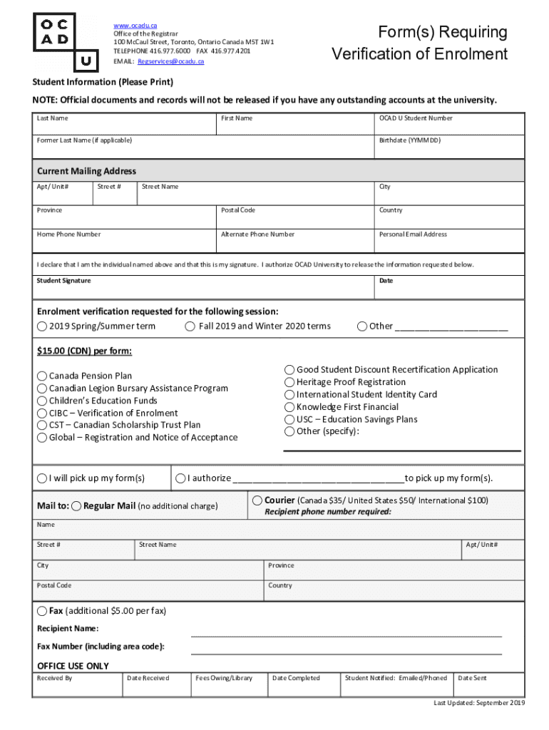 WWW.CDU.ca Office of the Registrar 100 McCaul Street, Toronto, Ontario Canada M5T 1W1 TELEPHONE 416.977.6000 FAX 416.977.4201 EMAIL: Regservices@ocadu.caForm(s) Requiring Verification of EnrolmentStudent