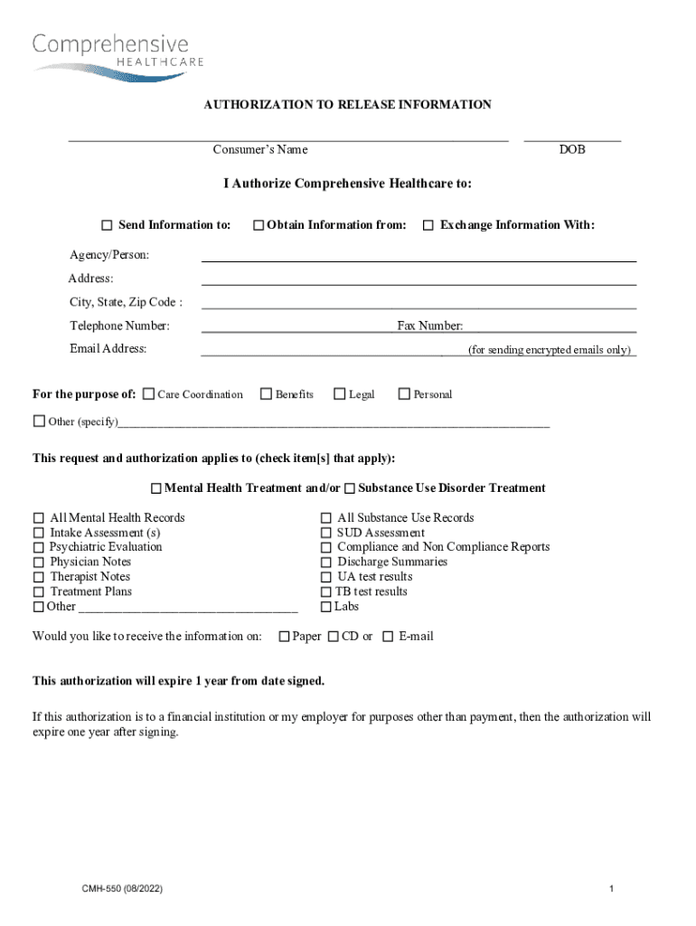 AUTHORIZATION TO RELEASE INFORMATION Consumers Named Authorize Comprehensive Healthcare to: Send Information to:Obtain Information from:Exchange Information With:Agency/Person: Address: City, State,
