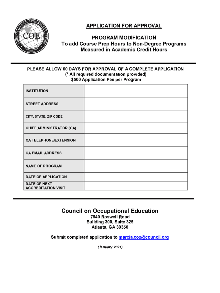 APPLICATION FOR APPROVAL PROGRAM MODIFICATION To add Course Prep Hours to NonDegree Programs Measured in Academic Credit Hours PLEASE ALLOW 60 DAYS FOR APPROVAL OF A COMPLETE APPLICATION (* All required