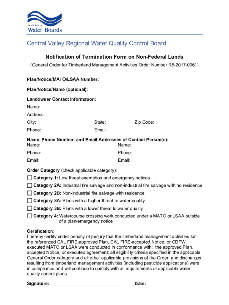 Central Valley Regional Water Quality Control Board Notification of Termination Form on Confederal Lands (General Order for Timberland Management Activities Order Number R520170061) Plan/Notice/NATO/LSA