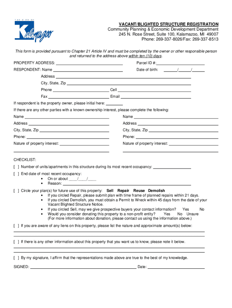 VACANT/BLIGHTED STRUCTURE REGISTRATION Community Planning & Economic Development Department 245 N. Rose Street, Suite 100, Kalamazoo, MI 49007 Phone: 2693378026/Fax: 2693378513 This form is provided