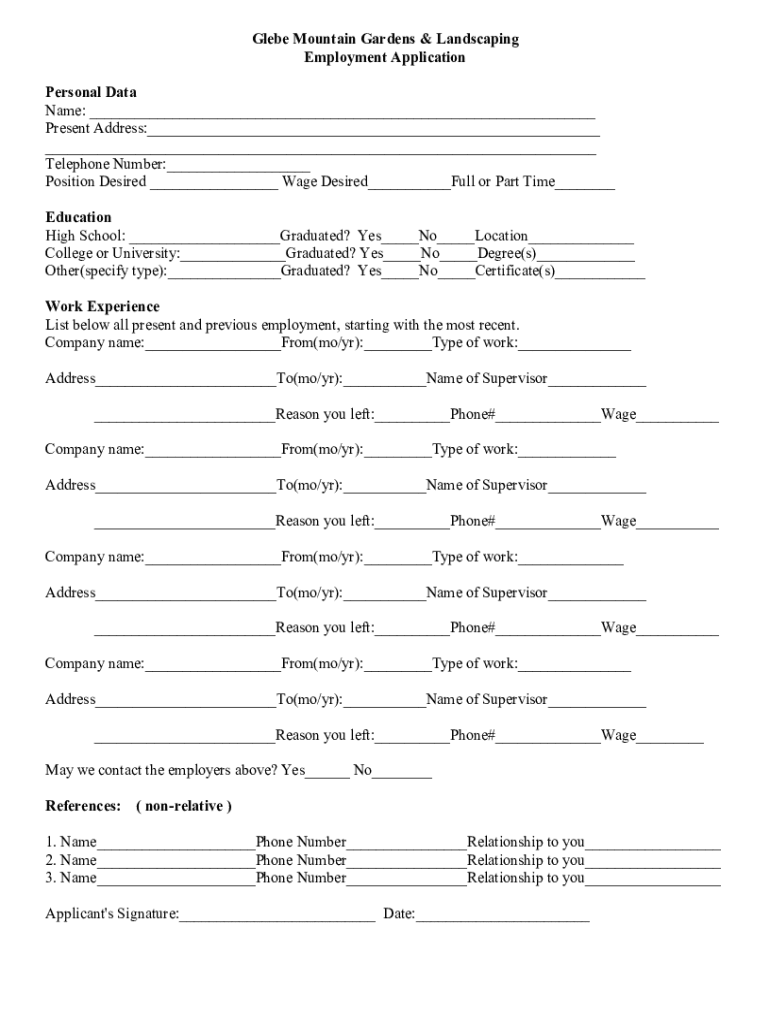 Globe Mountain Gardens & Landscaping Employment Application Personal Data Name: ___ Present Address:___ ___ Telephone Number:___ Position Desired ___ Wage Desired___Full or Part Time___ Education