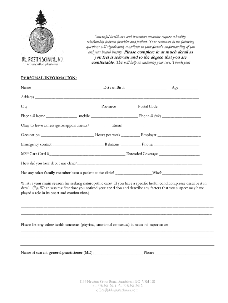 Information such as past medical history, current symptoms, medications, supplements, diet, exercise, and lifestyle habits must be reported on the naturopathic adult intake form.