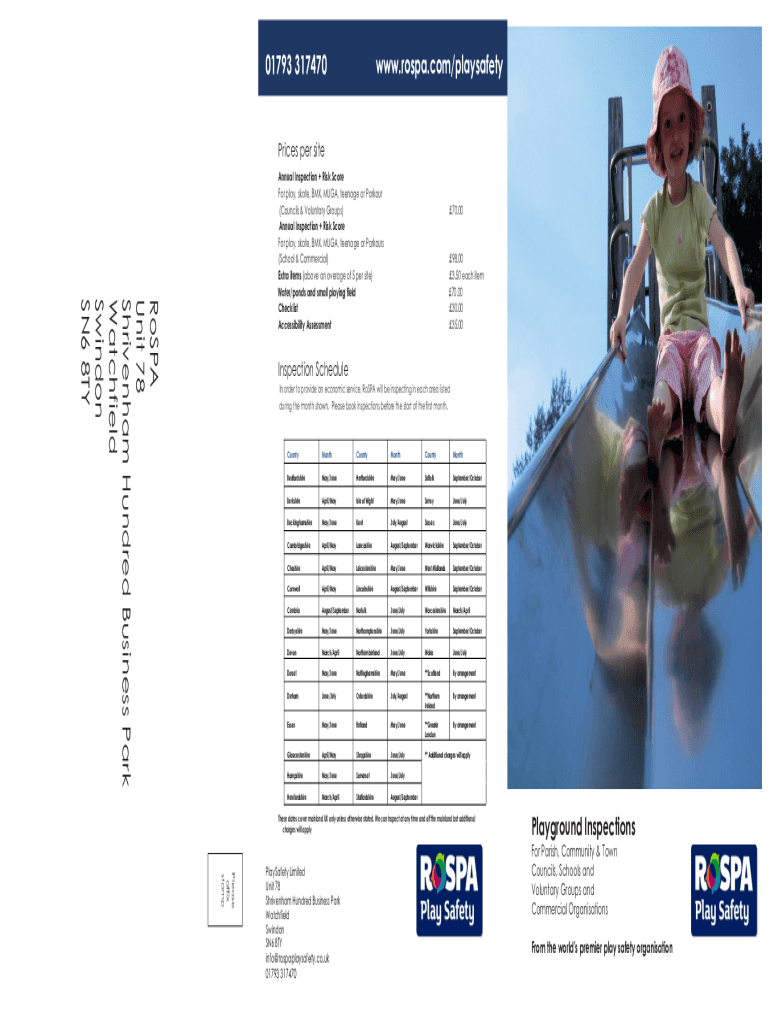 01793 317470www.rospa.com/playsafetyPrices per siteRoSPA Unit 78 Shriven ham A Hundred Business Park Watch field Swindon SN6 8TYas safe as necessary, Annual Inspection + Risk Score For play, skate,