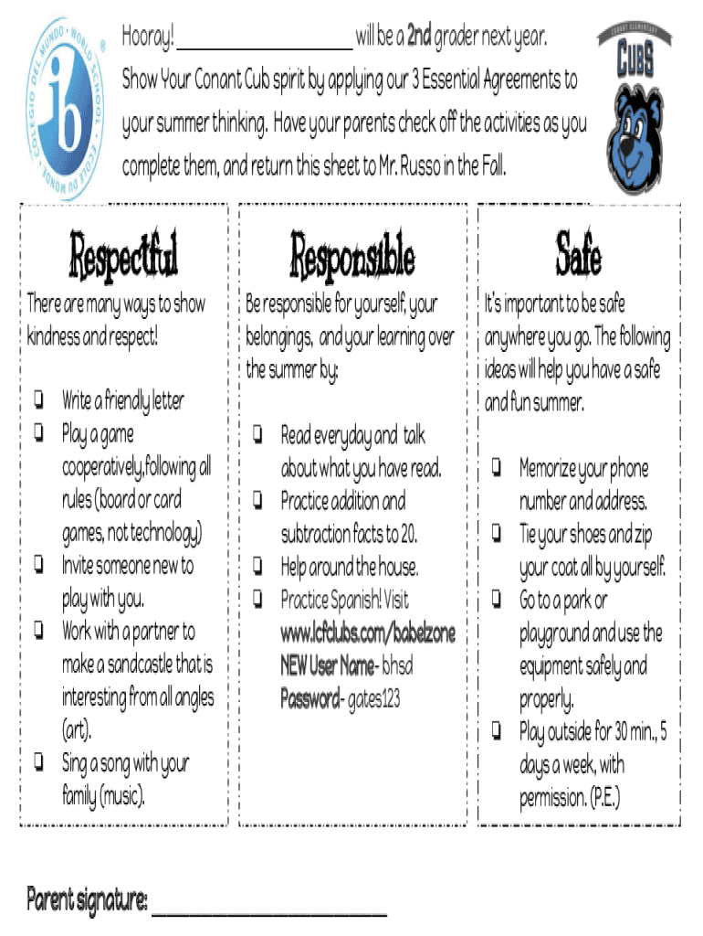 Hooray! ___ will be a 2nd grader next year. Show Your Conan Cub spirit by applying our 3 Essential Agreements to your summer thinking. Have your parents check off the activities as you complete them,