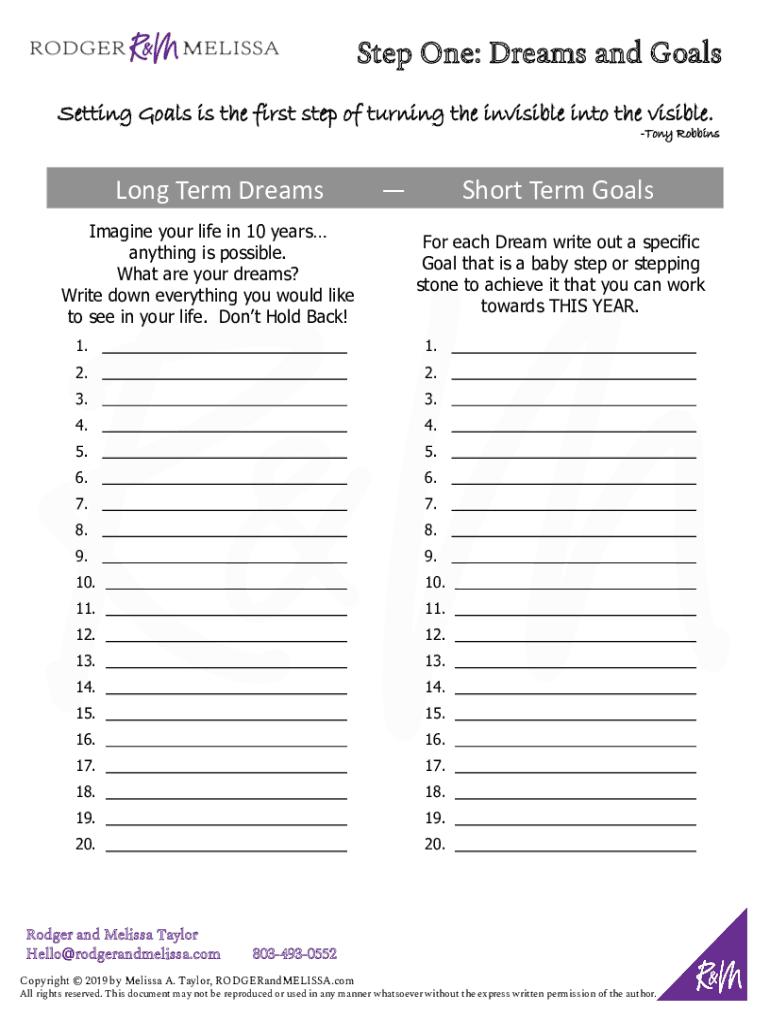 Step One: Dreams and Goals Setting Goals is the first step of turning the invisible into the visible. Tony Robbins Long Term Dreams Imagine your life in 10 years anything is possible. What are your