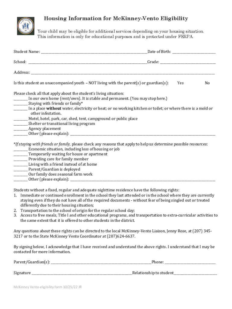 Housing Information for McKinneyVento Eligibility Your child may be eligible for additional services depending on your housing situation. This information is only for educational purposes and is protected