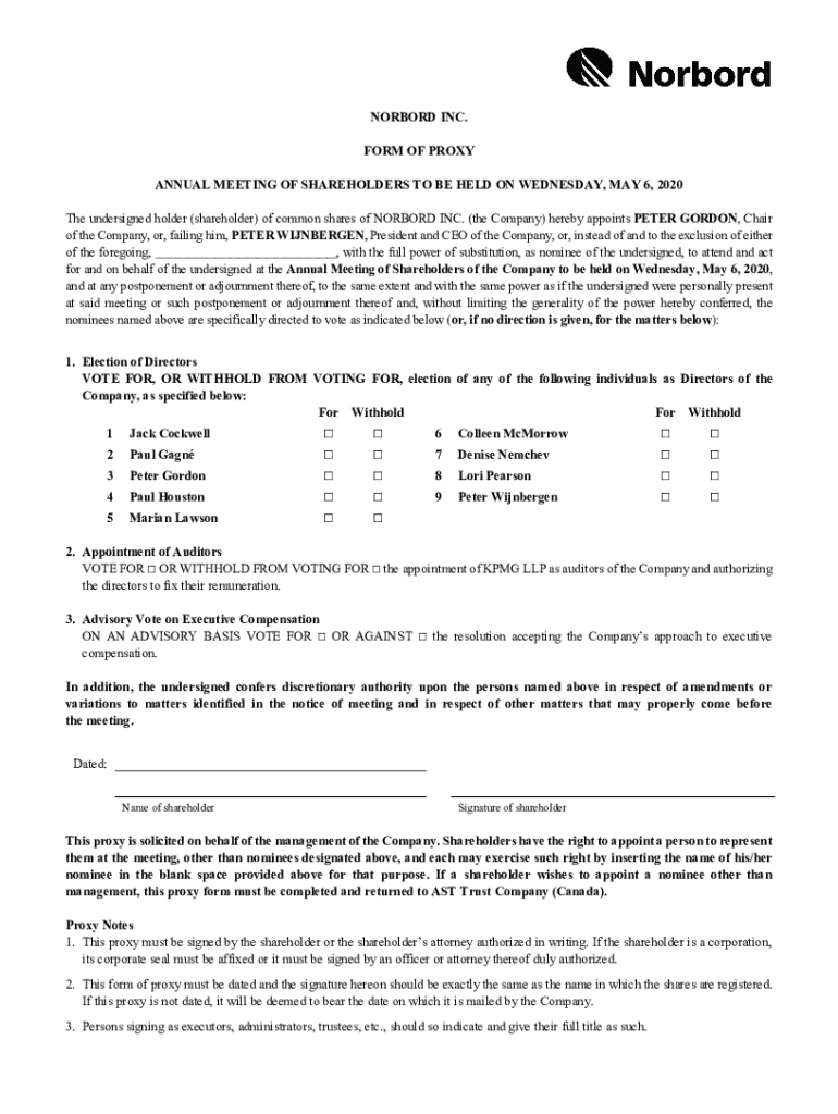 NORBERT INC. FORM OF PROXY ANNUAL MEETING OF SHAREHOLDERS TO BE HELD ON WEDNESDAY, MAY 6, 2020, The undersigned holder (shareholder) of common shares of NORBERT INC. (the Company) hereby appoints