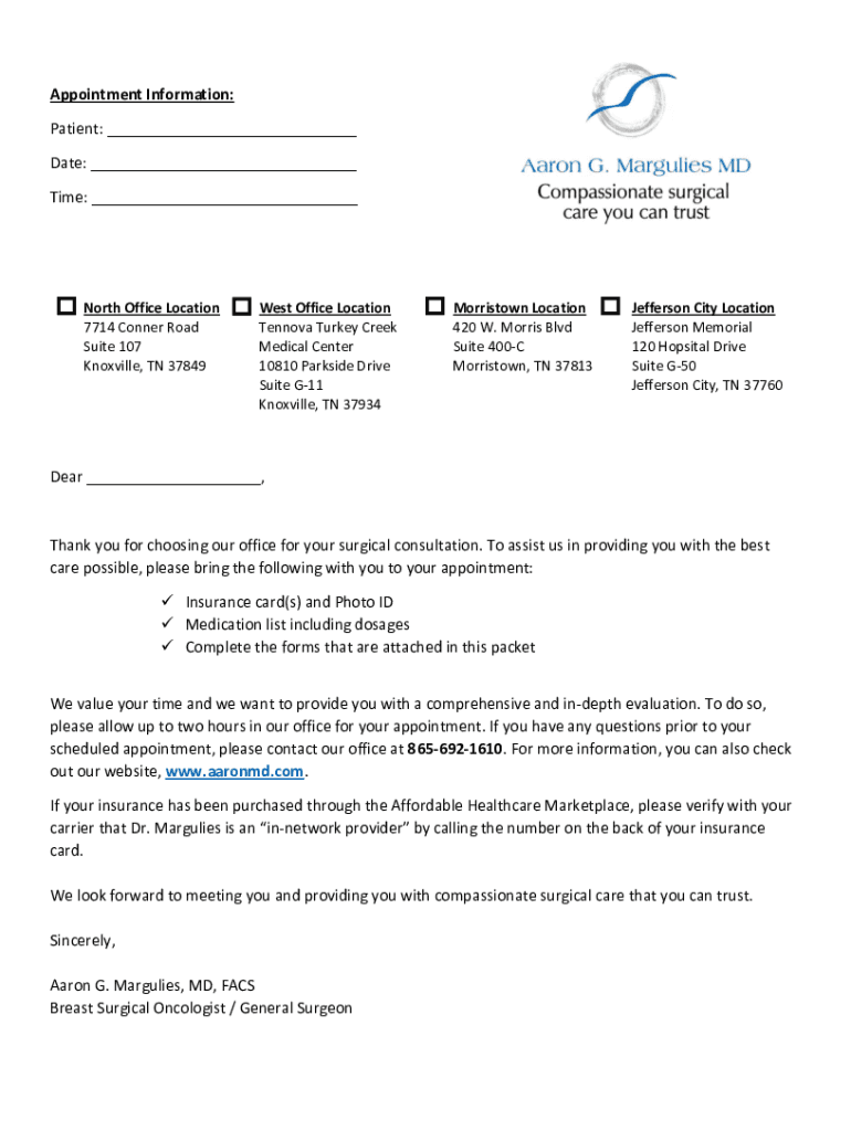 Appointment Information: Patient: ___ Date: ___ Time: ___North Office Location 7714 Conner Road Suite 107 Knoxville, TN 37849West Office Location Ten nova Turkey Creek Medical Center 10810 Park side