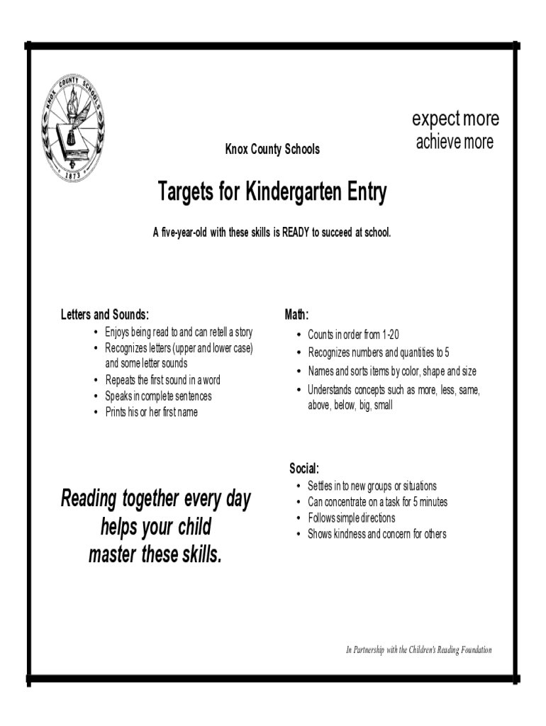 Expect more achieve more Knox County SchoolsTargets for Kindergarten Entry A fiveyearold with these skills is READY to succeed at school. Letters and Sounds: Enjoys being read to and can retell a