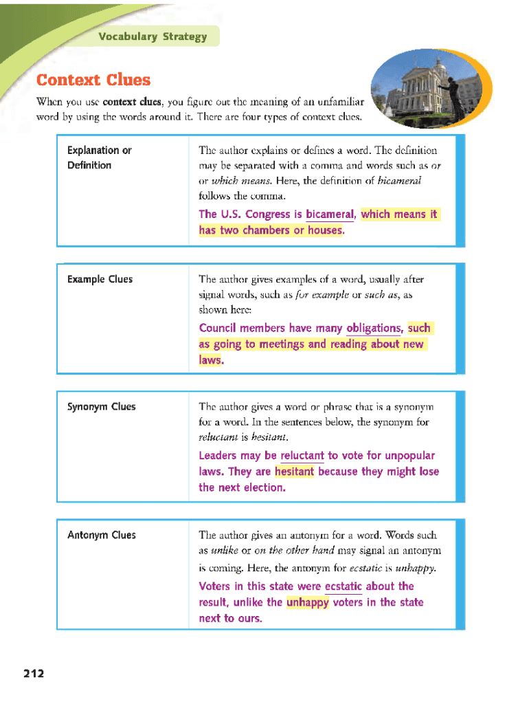 Vocabulary StrategyContext Clues When you use context clues, you figure out the meaning of an unfamiliar word by using the surrounding words. There are four types of context clues. Explanation or