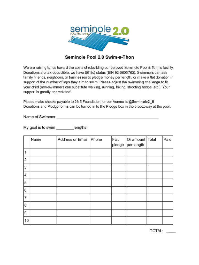 Seminole Pool 2.0 Animation We are raising funds toward the costs of rebuilding our beloved Seminole Pool & Tennis facility. Donations are tax-deductible, we have 501(c) status (EIN 920605763). Swimmers