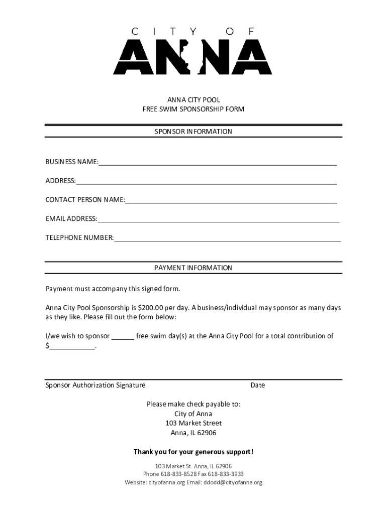 ANNA CITY POOL FREE SWIM SPONSORSHIP FORM SPONSOR INFORMATIONBUSINESS NAME:___ ADDRESS:___ CONTACT PERSON NAME:___ EMAIL ADDRESS:___ TELEPHONE NUMBER:___PAYMENT INFORMATION Payment must accompany