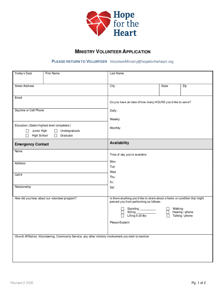 PLEASE RETURN TO VOLUNTEER VolunteerMinistry@hopefortheheart.org