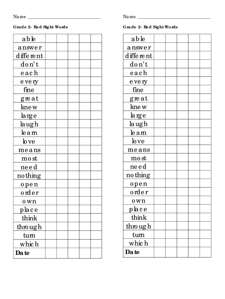 Name ___Name ___Grade 2 Red Sight WordsGrade 2 Red Sight Word sable answer different don't each every fine great knew large laugh learn love means most need nothing open order own place think through