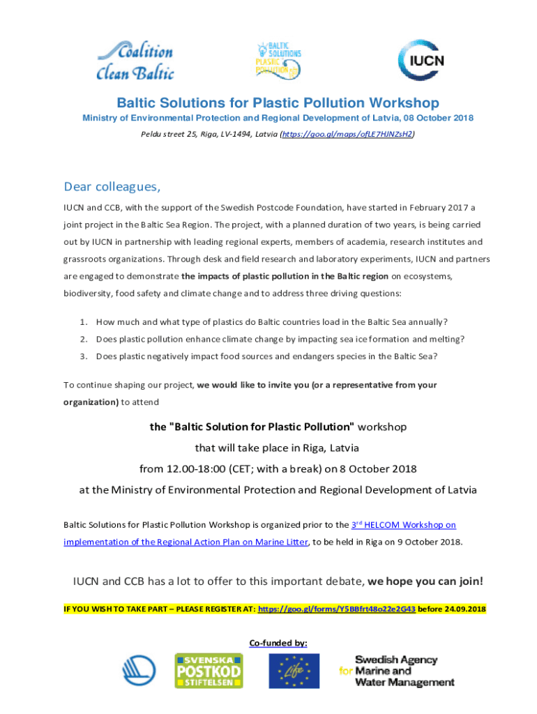 Baltic Solutions for Plastic Pollution Workshop Ministry of Environmental Protection and Regional Development of Latvia, 08 October 2018 Held street 25, Riga, LV1494, Latvia (https://goo.gl/maps/ofLE7HJNZsH2)Dear
