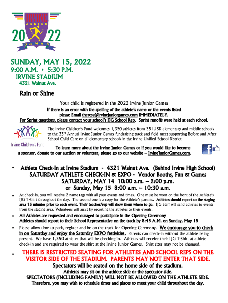 SUNDAY, MAY 15, 2022 9:00 A.M. 5:30 P.M. IRVINE STADIUM 4321 Walnut Ave. Rain or Shine Your child is registered in the 2022 Irvine Junior Games If there is an error with the spelling of the athletes