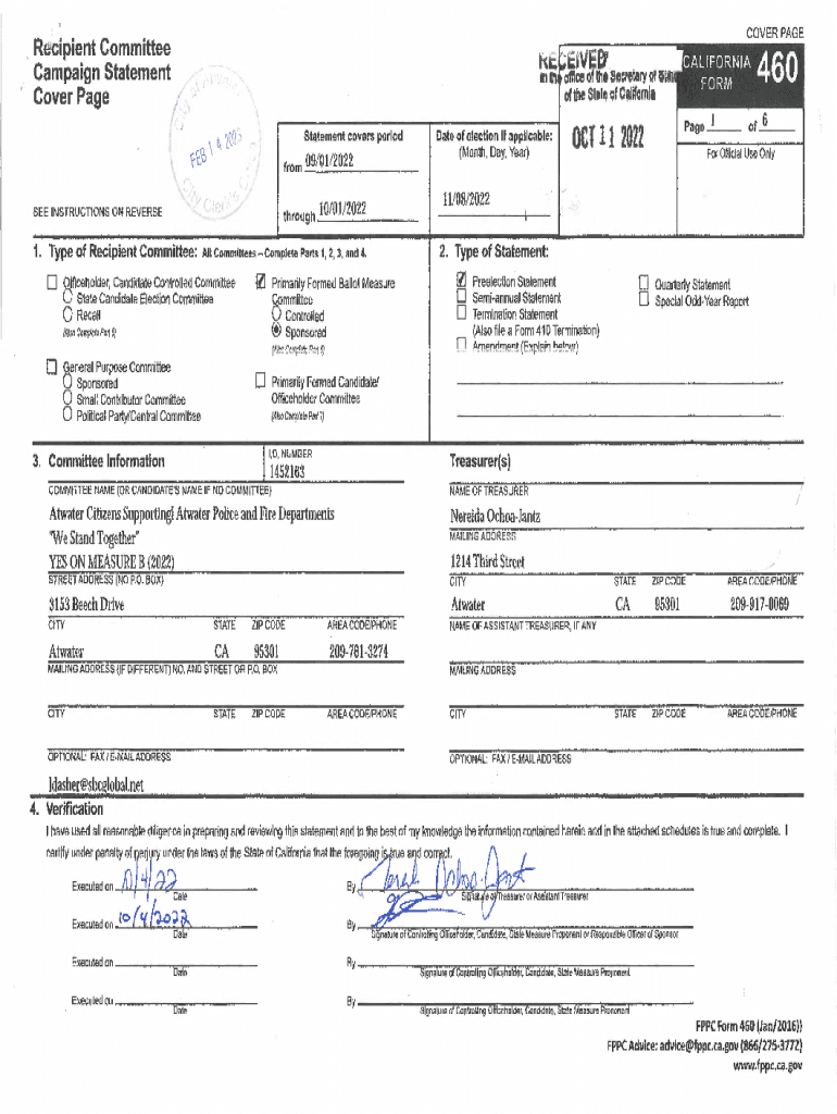 . Recipient Committee Campaign Statement Cover Recover PAGE., \”, .,Key: 1:aVED1\' In office of THT Sell\'TTL, Y OT IHIIICALIFORNIA FORM of the Stat, i of Callfoml1_)Statement covers period from09/01/2022Date