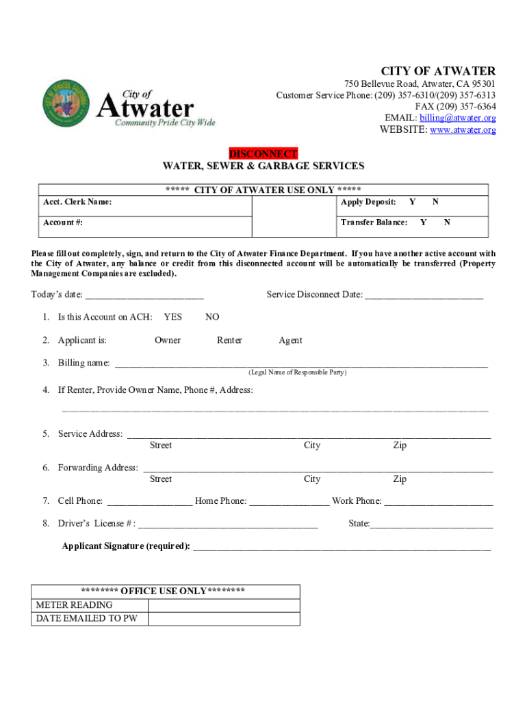 CITY OF ATW ATER 750 Bellevue Road, At water, CA 95301 Customer Service Phone: (209) 3576310/(209) 3576313 FAX (209) 3576364 EMAIL: billing@atwater.org WEBSITE: www.atwater.orgDISCONNECT WATER, SEWER