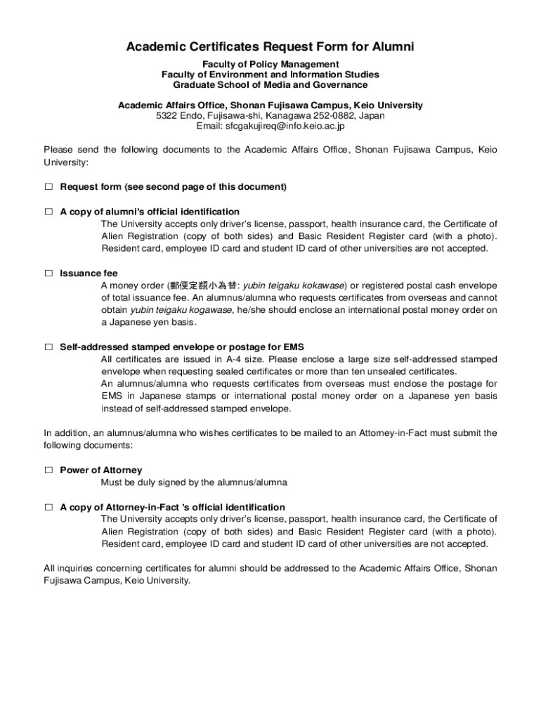 Academic Certificates Request Form for Alumni Faculty of Policy Management Faculty of Environment and Information Studies Graduate School of Media and Governance Academic Affairs Office, Shōnen Fujiyama