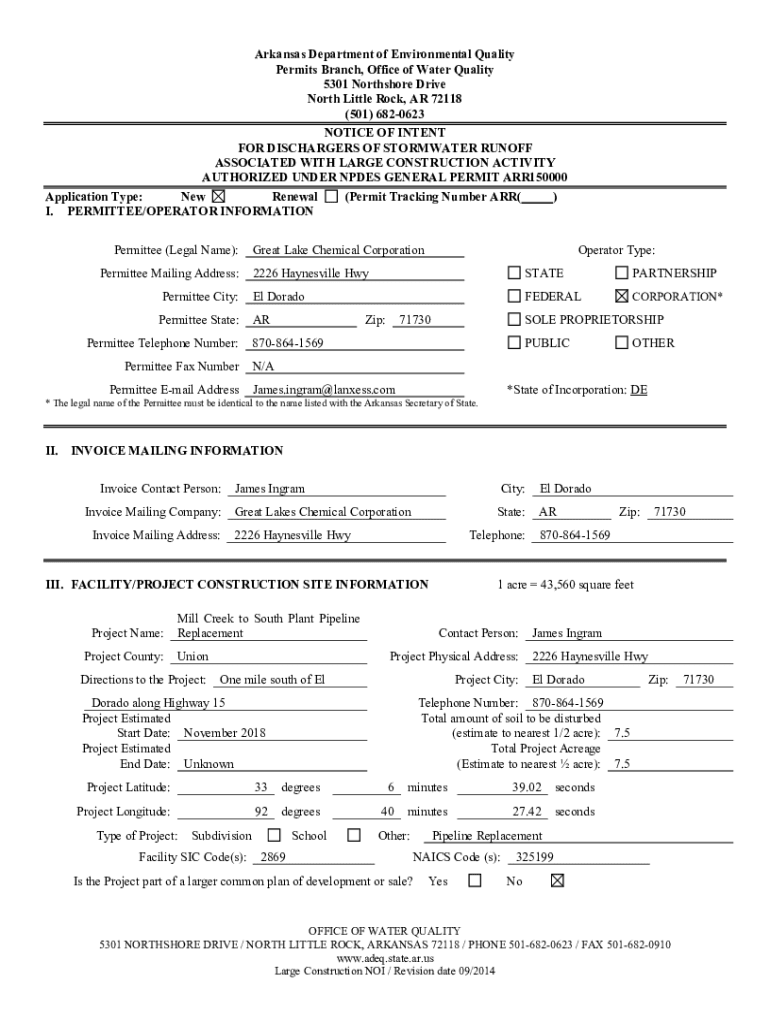 Arkansas Department of Environmental Quality Permits Branch, Office of Water Quality 5301 North shore Drive North Little Rock, AR 72118 (501) 6820623 NOTICE OF INTENT FOR DISCHARGERS OF STORMWATER