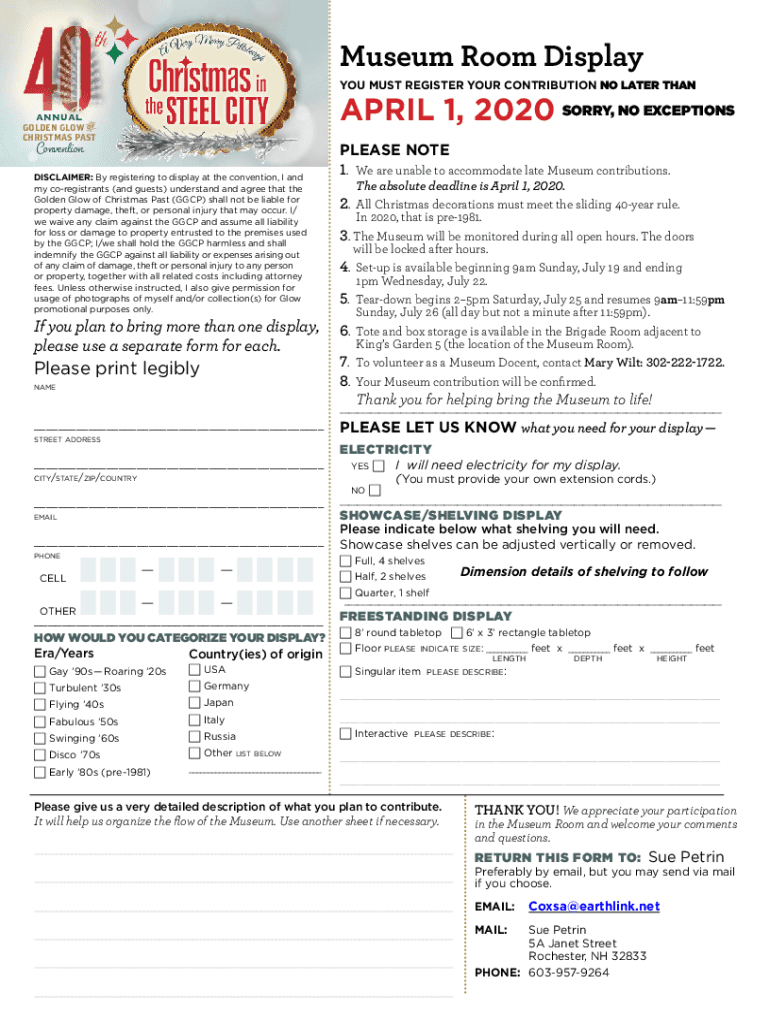 Museum Room Display YOU MUST REGISTER YOUR CONTRIBUTION NO LATER THANAPRIL 1, 2020 SORRY, NO EXCEPTIONSANNUALGOLDEN GLOW o CHRISTMAS PASTConventionDISCLAIMER: By registering to display at the convention,