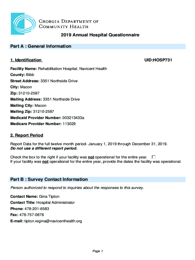 2019 Annual Hospital Questionnaire Part A : General Information 1. Identification:HOSP731Facility Name: Rehabilitation Hospital, Nascent Health County: BBB Street Address: 3351 Northside Drive City: