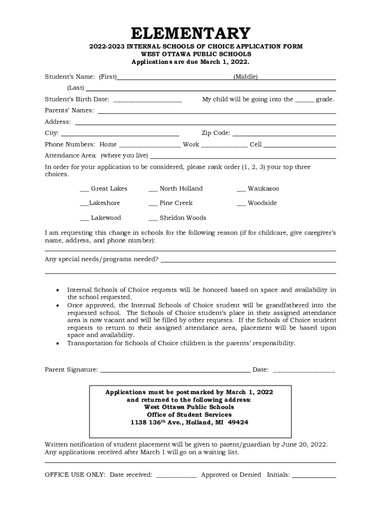 ELEMENTARY20222023 INTERNAL SCHOOLS OF CHOICE APPLICATION FORM WEST OTTAWA PUBLIC SCHOOLS Applications are due March 1, 2022. Students Name: (First)(Middle)(Last) Students Birth Date: ___My child