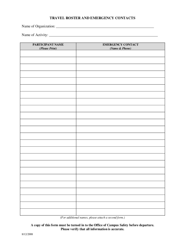 TRAVEL ROSTER AND EMERGENCY CONTACTS Name of Organization: ___ Name of Activity: ___ PARTICIPANT NAME (Please Print)EMERGENCY CONTACT (Name & Phone)(For additional names, please attach a second form.)