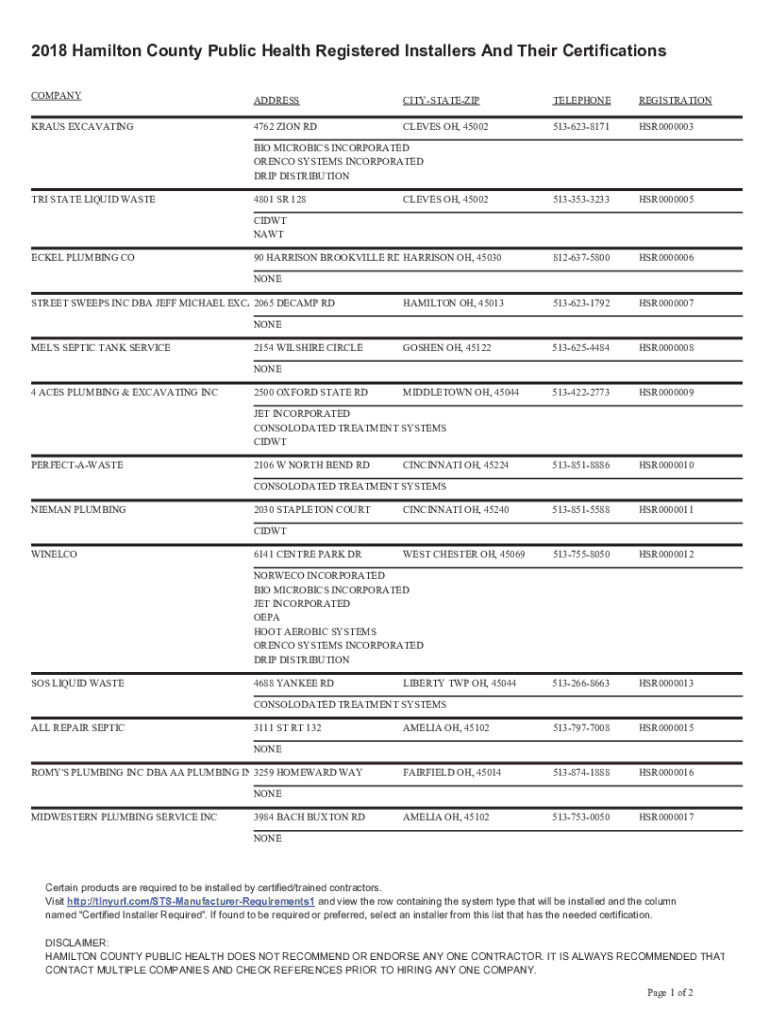 2018 Hamilton County Public Health Registered Installers And Their Certifications COMPANYADDRESSCITYSTATEZIPTELEPHONEREGISTRATIONKRAUS EXCAVATING4762 ZION CLEVES OH, 450025136238171HSR00000035133533233HSR00000058126375800HSR0000006HAMILTON
