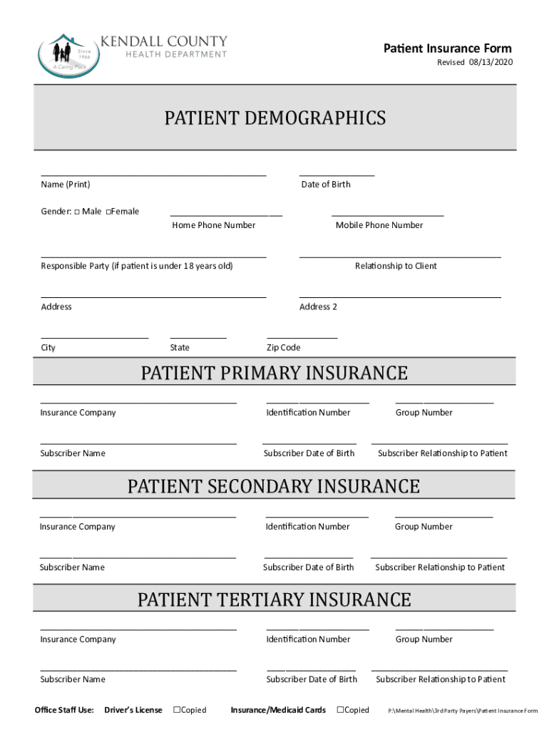 Patient Insurance Form Revised 08/13/2020PATIENT DEMOGRAPHICS ___ Name (Print) Gender: Male Female___ Date of Birth___ Home Phone Number___ Mobile Phone Number___ Responsible Party (if patient is