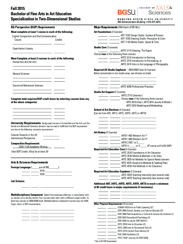 Fall 2015 Bachelor of Fine Arts in Art Education Specialization in Dimensional Studies205 Administration Building 4193722015BG Perspective (BGP) Requirements Major Requirements (Minimum of 85 Hrs.)