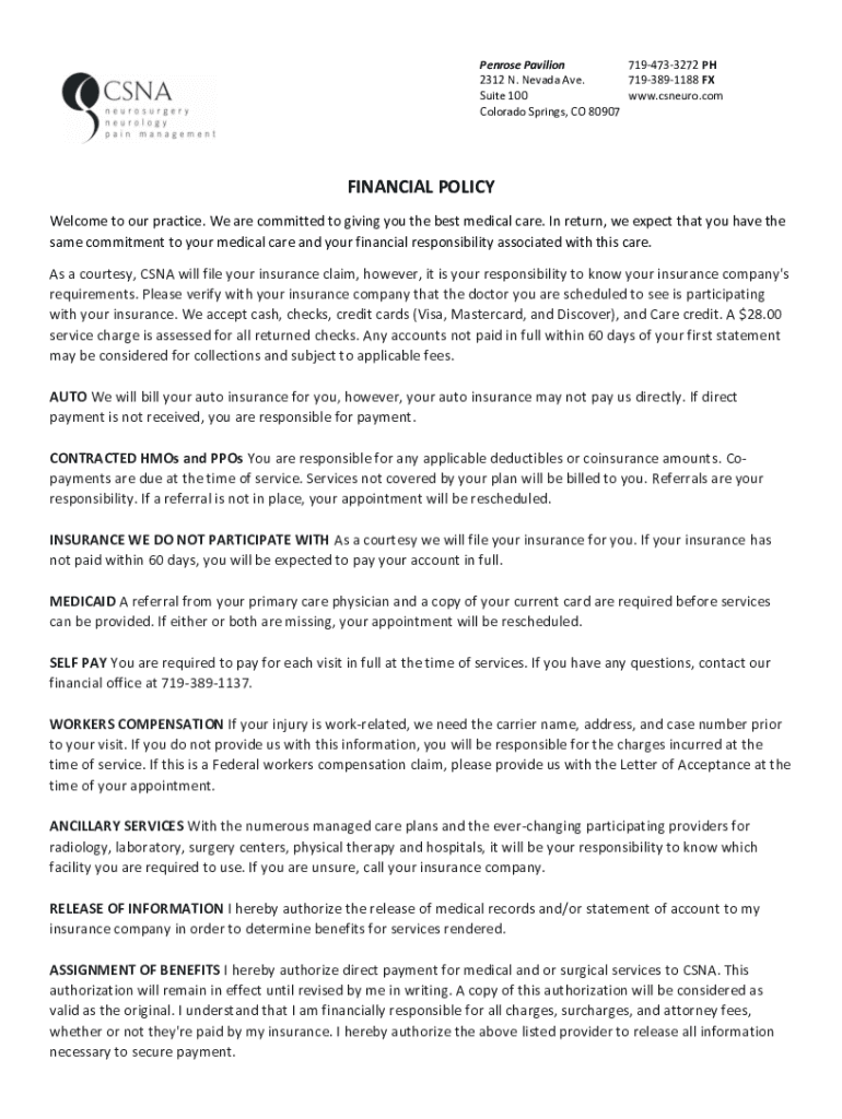 Penrose Pavilion 7194733272 PH 2312 N. Nevada Ave. 7193891188 FX Suite 100 www.csneuro.com Colorado Springs, CO 80907FINANCIAL POLICY Welcome to our practice. We are committed to giving you the best