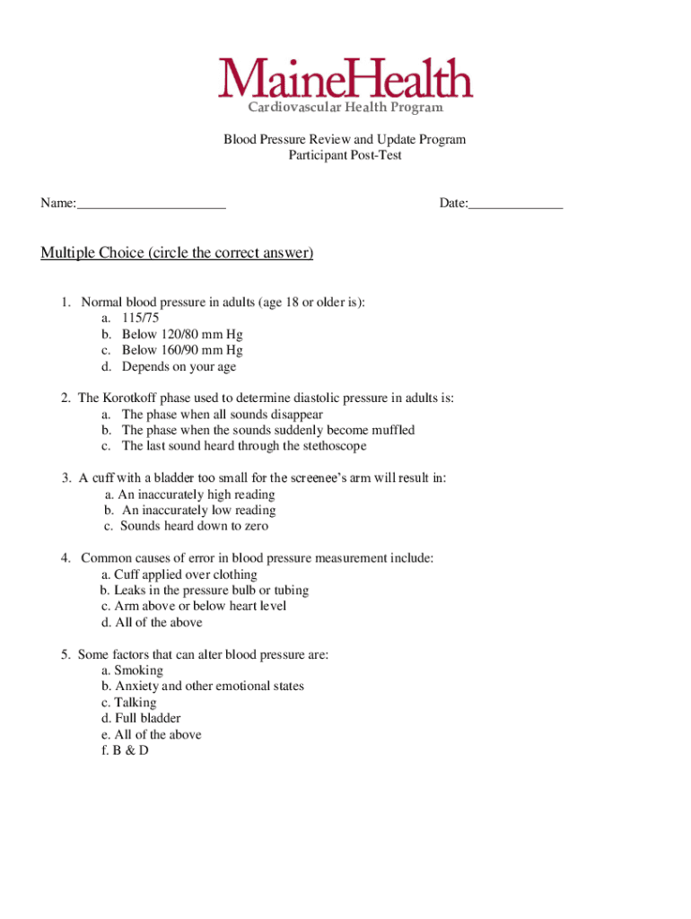 Cardiovascular Health Program Blood Pressure Review and Update Program Participant PostTestName:___Date:___Multiple Choice (circle the correct answer) 1. Normal blood pressure in adults (age 18 or