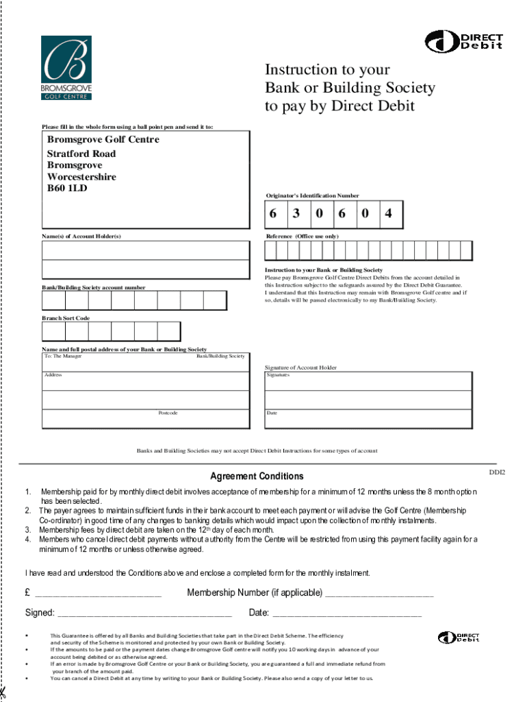 Instruction to your Bank or Building Society to pay by Direct Debit Please fill in the whole form using a ball point pen and send it to:Cosgrove Golf Center Stratford Road Cosgrove Worcestershire
