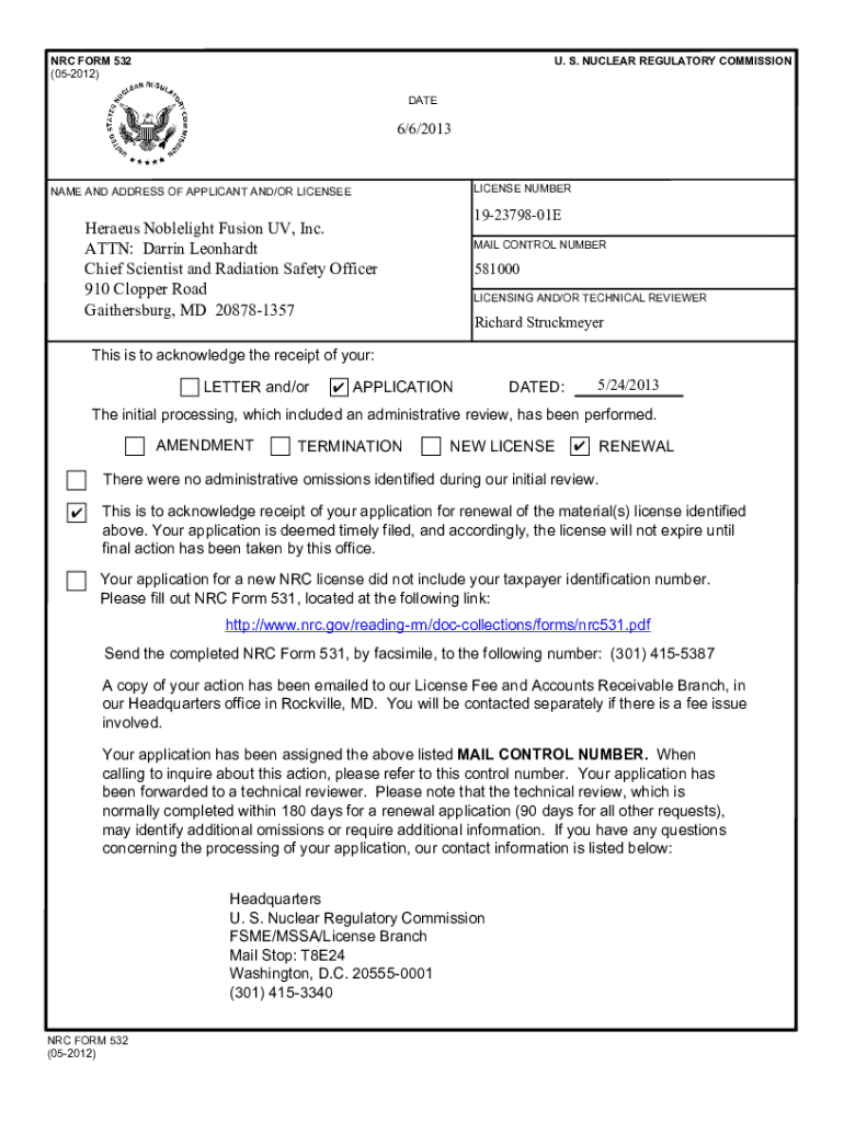 U. S. NUCLEAR REGULATORY COMMISSION NRC FORM 532 (052012) DATE6/6/2013LICENSE CUMBERSOME AND ADDRESS OF APPLICANT AND/OR LICENSEE192379801EHeraeus Noble light Fusion UV, Inc. ATTN: Darrin Leonard