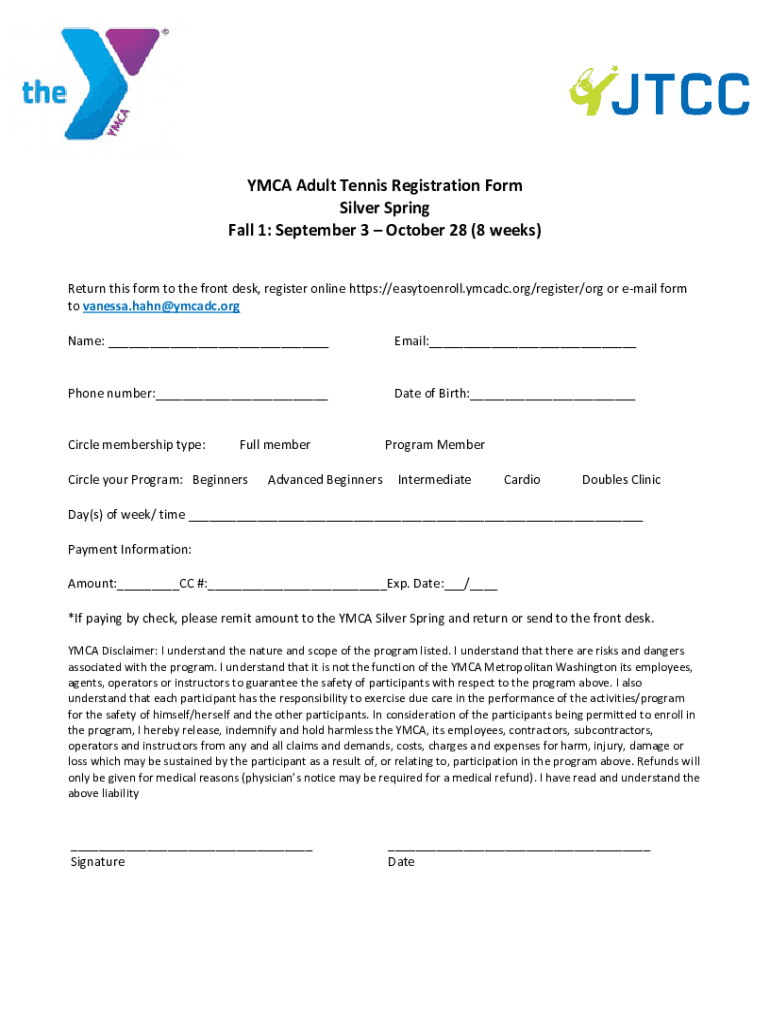 YMCA Adult Tennis Registration Form Silver Spring Fall 1: September 3 October 28 (8 weeks) Return this form to the front desk, register online https://easytoenroll.ymcadc.org/register/org or email