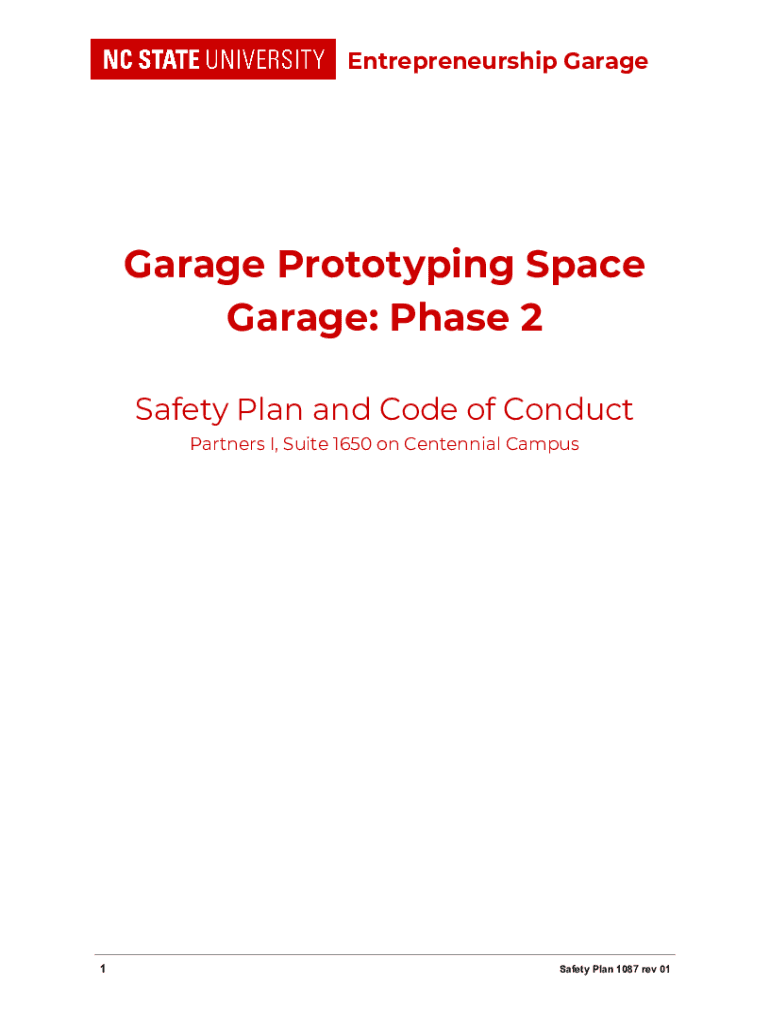 Entrepreneurship Garage Prototyping Space Garage: Phase 2 Safety Plan and Code of Conduct Partners I, Suite 1650 on Centennial Campus 1Safety Plan 1087 rev 01Entrepreneurship Manageable of Contents