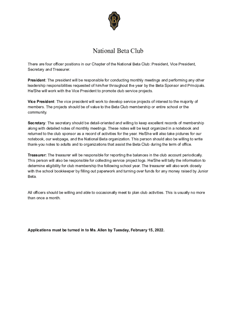 National Beta Club There are four officer positions in our Chapter of the National Beta Club: President, Vice President, Secretary and Treasurer. President: The president will be responsible for conducting