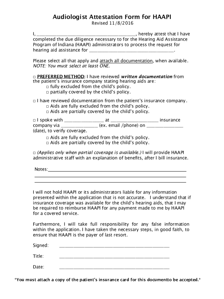 Audiologist Attestation Form for HA API Revised 11/8/2016I, ___, hereby attest that I have completed the due diligence necessary to for the Hearing Aid Assistance Program of Indiana (HA API) administrators