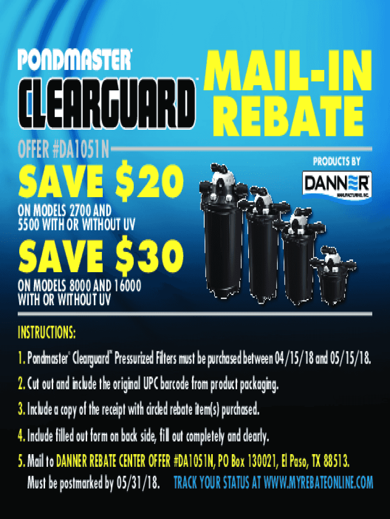 MAILING REBATEOFFER #DA1051NSAVE $20PRODUCTS LYON MODELS 2700 AND 5500 WITH OR WITHOUT SAVE $30 ON MODELS 8000 AND 16000 WITH OR WITHOUT INSTRUCTIONS: 1. Pond master Clear guard Pressurized Filters
