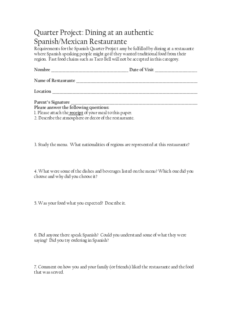 Quarter Project: Dining at an authentic Spanish/Mexican Restaurant Requirements for the Spanish Quarter Project Amy be fulfilled by dining at a restaurant where Spanish-speaking people might go if