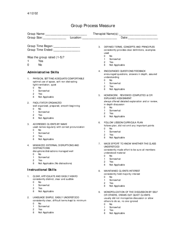 4/12/02Group Process Measure Group Name:___ Therapist Name(s):___ Group Size:___ Location:___ Date:___ Group Time Began:___ Group Time Ended:___3.DEFINED TERMS, CONCEPTS AND PRINCIPLES consistently