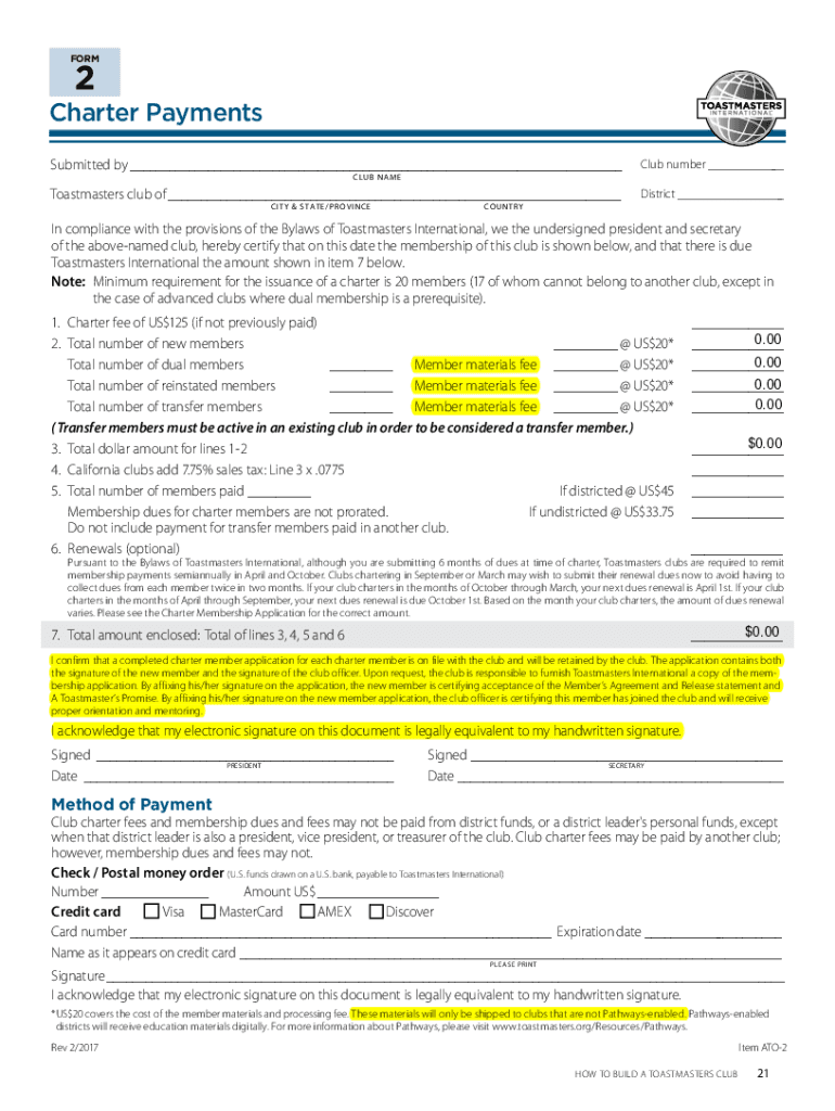 FORM2Charter Payments Submitted by ___Club number ___Toastmasters club of ___District ___CL U B N AME CITY & STATE / PROV IN CE COU N Train compliance with the provisions of the Bylaws of Toastmasters
