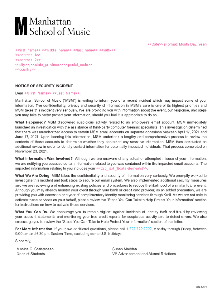 Date (Format: Month Day, Year) first_name middle_name last_name suffix address_1 address_2 city, state_province postal_code countryNOTICE OF SECURITY INCIDENT Dear First_Name Last_Name, Manhattan
