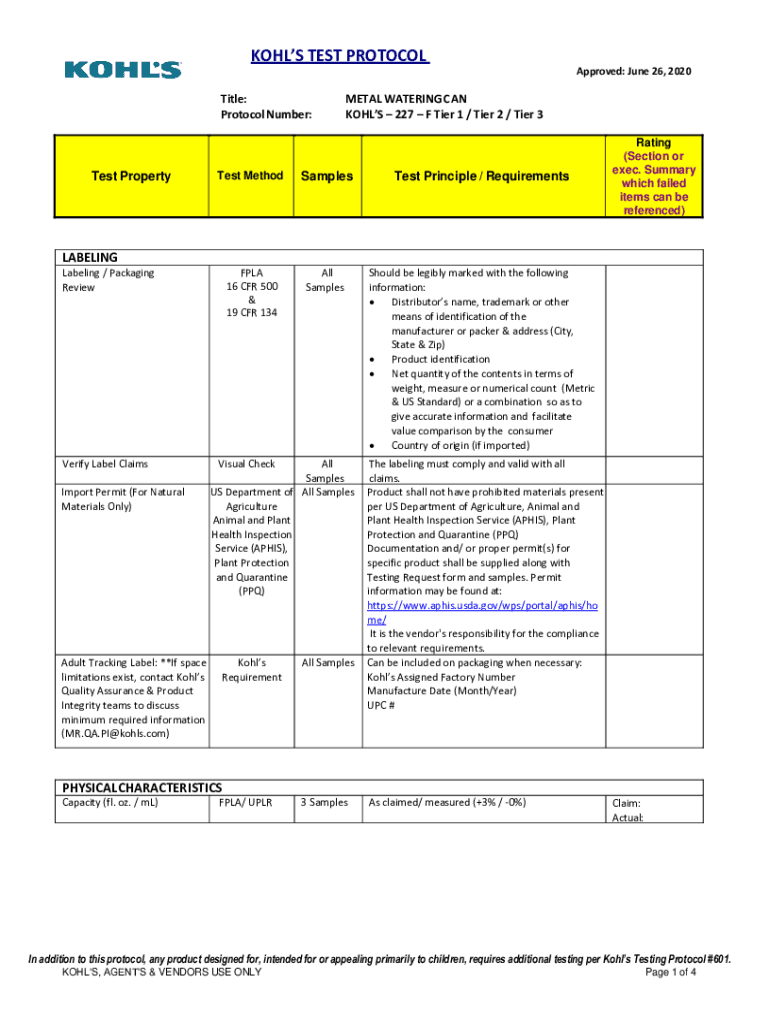 KOHL TEST PROTOCOL Approved: June 26, 2020Title: Protocol Number:Test PropertyMETAL WATERING CAN KOHL 227 F Tier 1 / Tier 2 / Tier 3Test MethodSamplesTest Principle / RequirementsFPLA 16 CFR 500 &